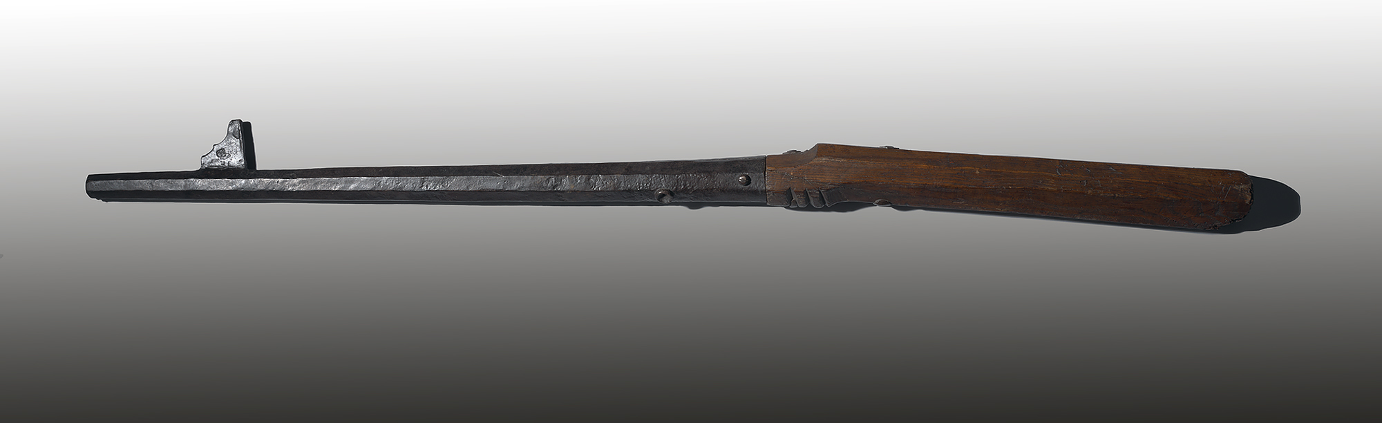 Haakbus, 1440 - 1460 ijzer, hout lengte: 164 cm; breedte: 10 cm; diepte: 8 cm; lengte loop: 95.5 cm; diameter: 3.4 cm; diameter loop: 3.4 cm; merk x: ovaal met 4 balletjes