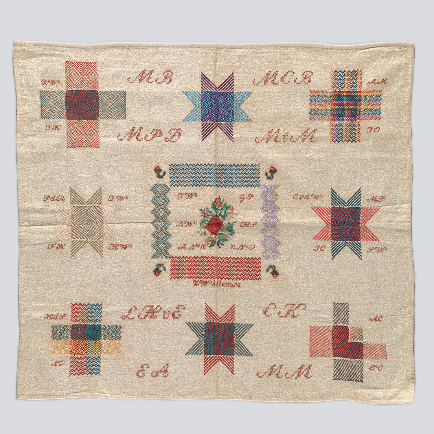 opschrift 1e rij, linkerstop, links boven en onder: BW / JK: onbekend, mogelijk Barend Willemse, broer van borduurster