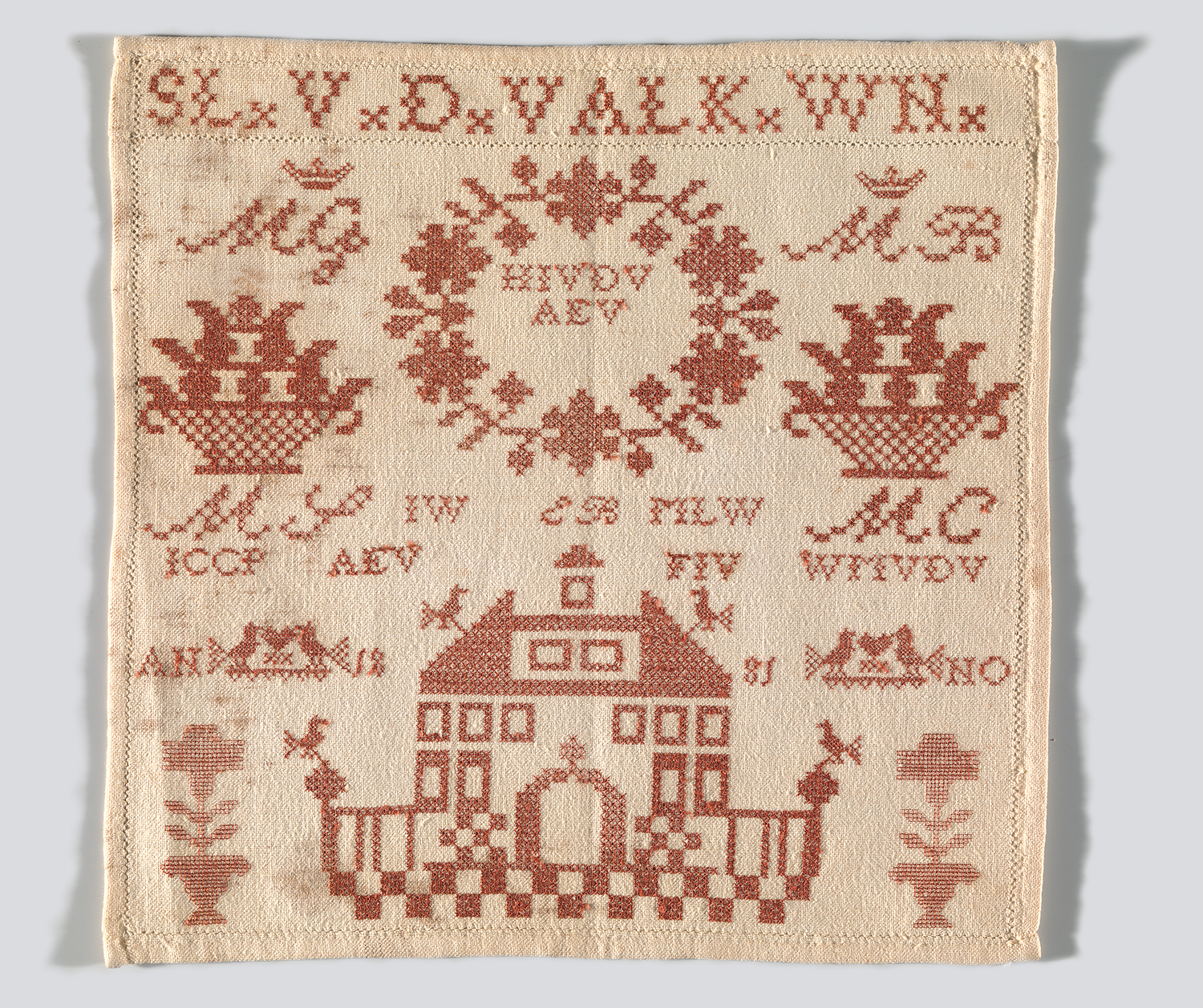 opschrift bovenzijde doek: SLxVxDxVALKxWNx: initialen van borduurster