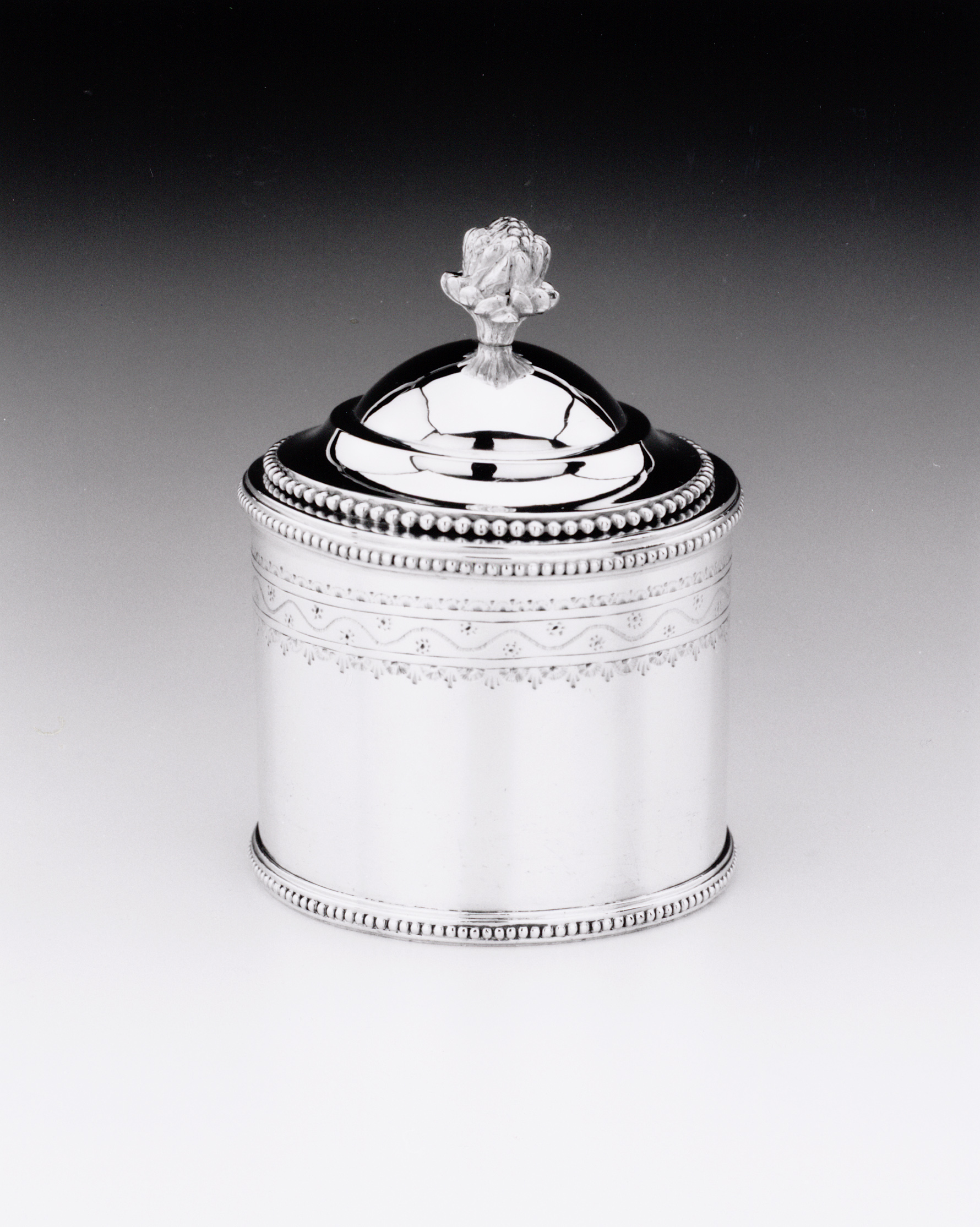Pyxis met cilindrische wand en gewelfd deksel. Rondom wand een gestoken band met een slingerlijn, rozetten, boogjes, palmetten en punten. Parelrand tussen profielranden langs onder- en bovenzijde wand. Deksel met parelrand en knop in vorm van bundel korenaren.