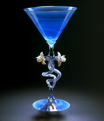 Lichtblauw opaliserend glas, helder kleurloos glas. Licht conische voet. Stam met twee staafjes, waartussen een geribde en gedraaide glasdraad, met aan elk uiteinde een bloem. Wijde conische kelk.