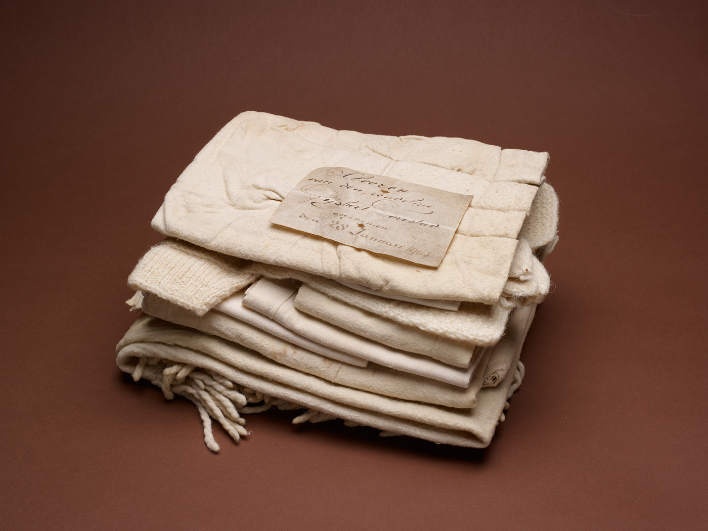 - opschrift stukje linnen: Kleeren van den vondeling Gijsbert Dorestad opgenomen den 28 januari 1903