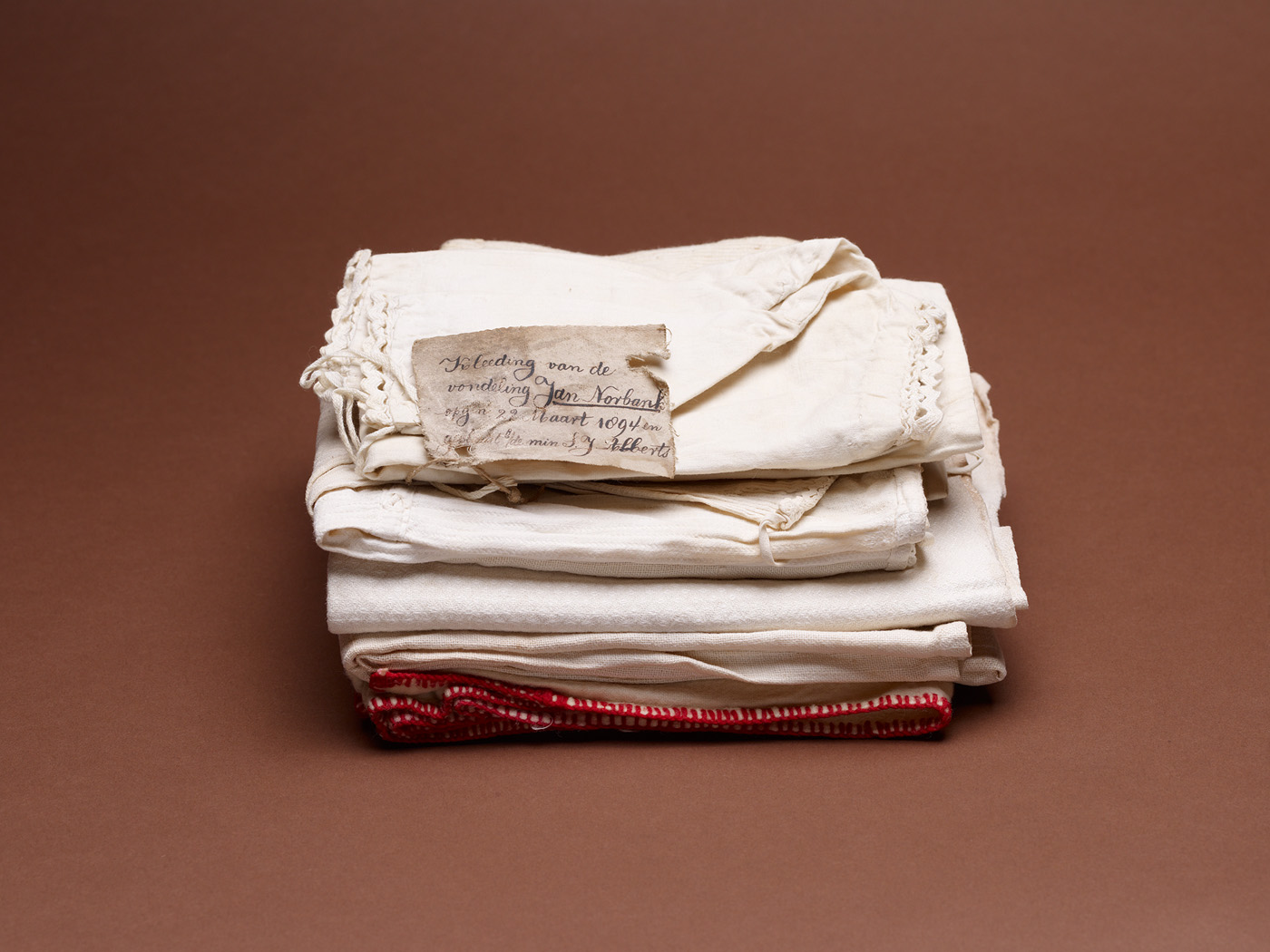- opschrift op stukje linnen: Kleeding van de vondeling Jan Norbank/opgen. 22 Maart 1894 en geplaatst bij de min S.J. Alberts
