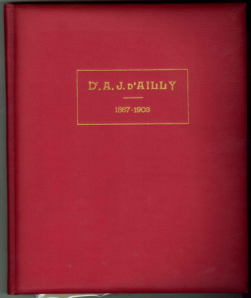 Liber amicorum met vele handtekeningen op geglaceerd wit karton, verguld op snee. Gebonden in roodleer, met in goud opdruk "Dr. A.J. D'AILLY/1867-1903". Voorin album zijn tevens losse documenten (brieven, postkaarten en krantenknipsels) gevoegd.
