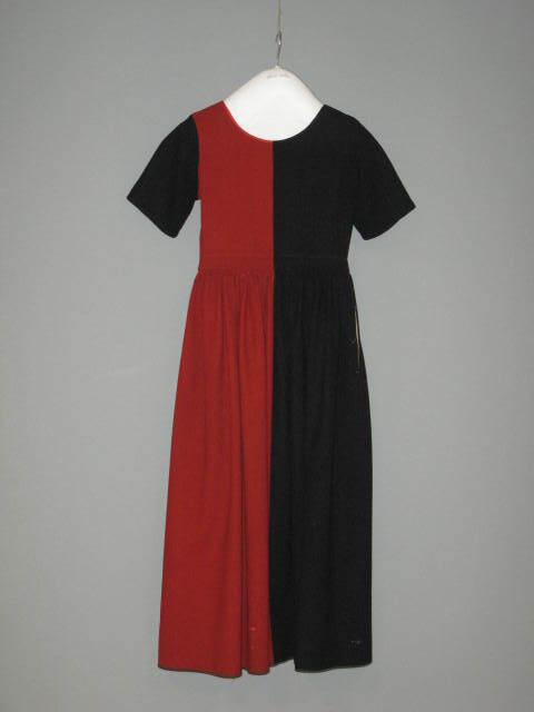 Zwart met rode jurk, met getailleerd lijfje, katoen gevoerd en een aangerimpelde rok. Sluiting d.m.v. metalen haakjes en oogjes, 3 haakjes en 2 oogjes missen. Hals met zwart (op zwarte deel) en rood (op rode deel) bandje afgezet, zoom afgezet met zwart bandje.