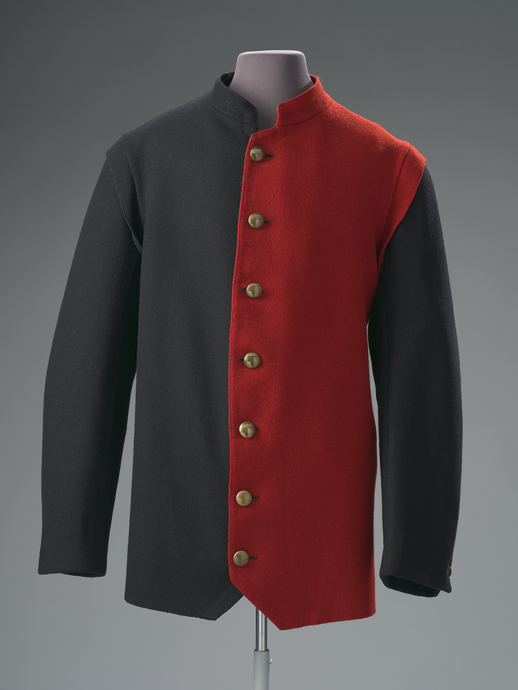 Jasje: half rood en half zwart met een opstaand boordje en lange zwarte mouwen. Het jasje sluit d.m.v. 7 koperen knopen. Knoop bij de pols, 2 knopen op het achter pand. Splitje middenachter.