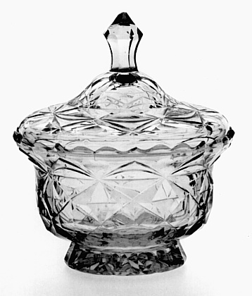 Helder kleurloos glas. Verdikte voet, de onderzijde in stervorm geslepen. Wijd bolvormig lichaam met geschulpte rand. Gewelfd deksel met puntig gefacetteerde knop. Lichaam en deksel in facetten en ruiten geslepen.