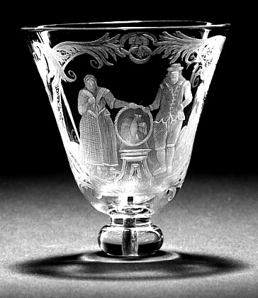Helder kleurloos glas. Conische kelk; in basis een koperen pennetje en schroef. Op kelk een door bladranken omgeven medaillon waarin een sokkel met duif in een stralenkrans, het embleem van het Burgerweeshuis, gehouden door een weesmeisje en -jongen. Gepolijste details.