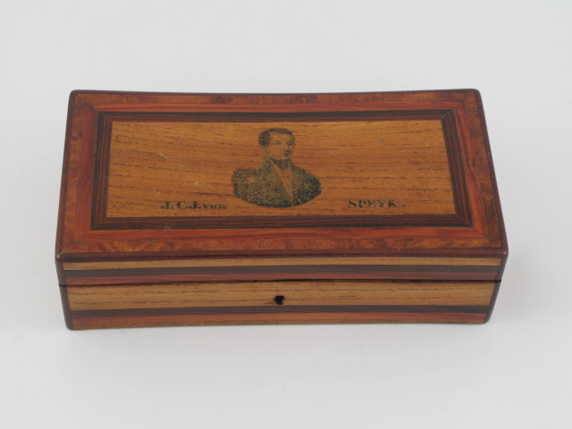 Rechthoekig houten doosje, bestaande uit diverse soorten hout. Voorzijde: afbeelding van Van Speyk en zijn naam. Brief in het houten doosje met uitleg herkomst doosje.