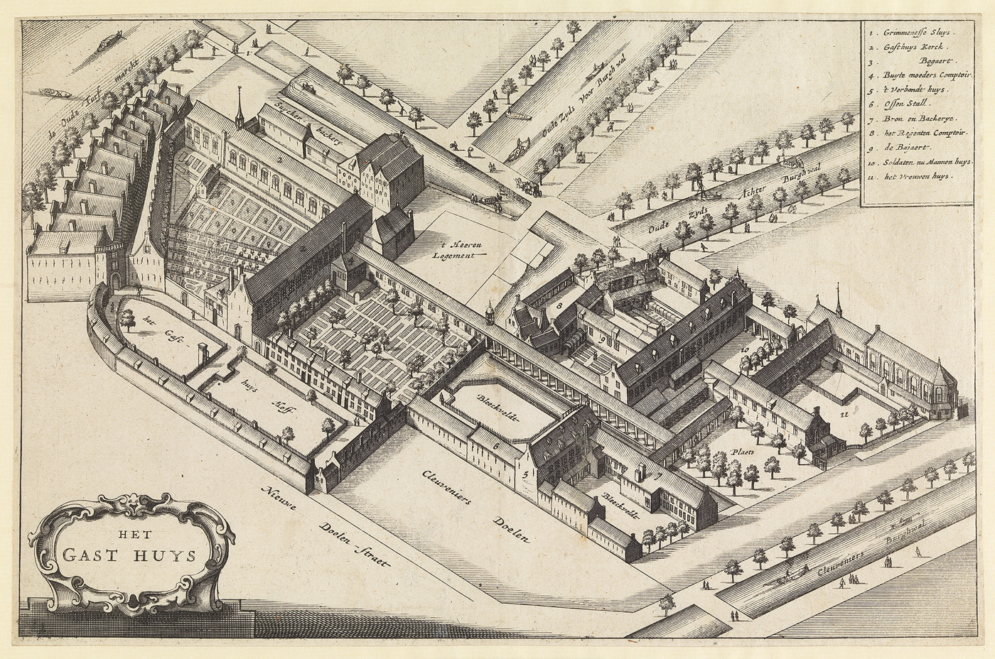 - titel linksonder in cartouche in de plaat: HET/GAST HUYS