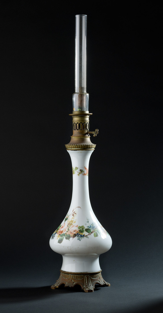In het Amsterdamse Burgerweeshuis konden kinderen van Amsterdamse poorters (burgers met rechten om in de stad te wonen) terecht, die geen ouders of een moeilijke thuissituatie hadden. In 1858 stapte het Burgerweeshuis over op moderne gasverlichting. De jongensslaapzaal was als eerste aan de beurt, daarna volgden de jongensbinnenplaats, meisjesafdeling en regentenzaal. In de archieven is duidelijk te zien dat het olie- en kaarsverbruik vervolgens geleidelijk afneemt. Olielampen bleven echter in ieder geval tot eind negentiende eeuw nog in gebruik. Deze olielamp van koper en wit porselein, gedecoreerd met een bloemmotief, stamt uit de tweede helft van de negentiende eeuw. De lamp kent een hoge, ronde voet met vier steunpunten, waarboven een peervormige buik, een lange hals en een koperen brander met glazen buis. ( Sarah Remmerts de Vries)