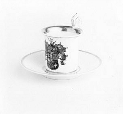 Kop en schotel, 1800 - 1899 onbekend porselein hoogte met oor: 11.5 cm; hoogte zonder oor: 8.5 cm; diameter bovenzijde kop: 9 cm; diameter met oor: 11 cm; diameter onderzijde: 6.8 cm; hoogte schotel: 2.8 cm; diameter schotel: 17.3 cm; opdruk voorzijde: het polychrome wapen van het geslacht Alewijn