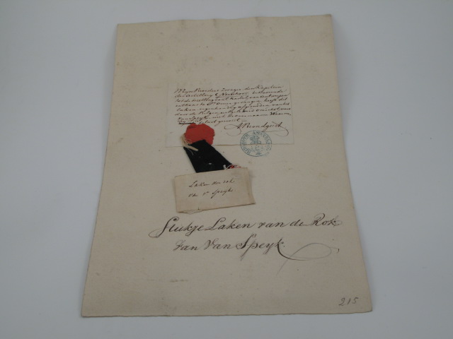 - Staaltje van lakense stof van de rok van Van Speijk, met verklarende, verzegelde beschrijving, 1821 - 1841