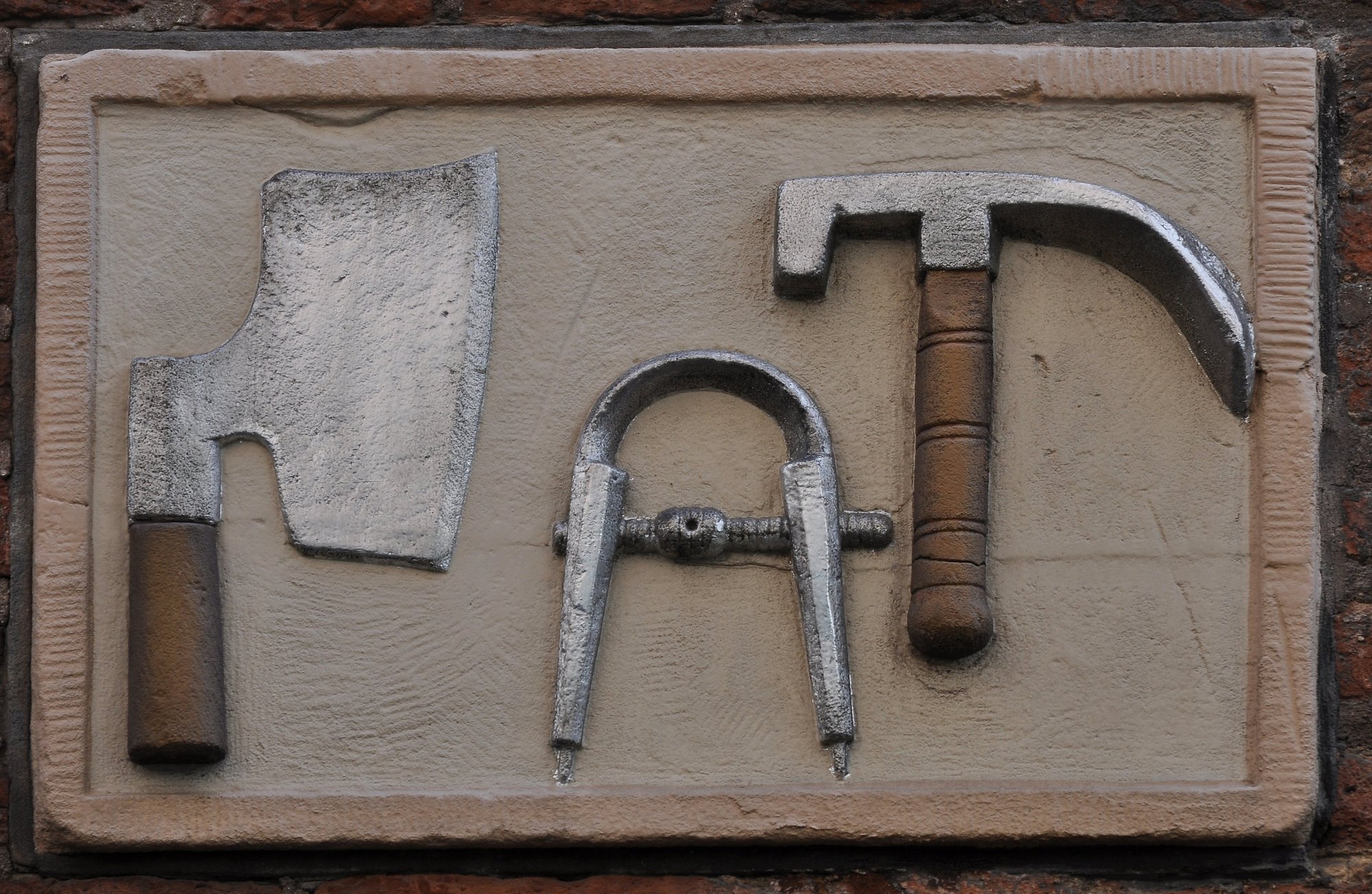 Drie stuks kuipersgereedschap, v.l.n.r.: korte bijl, passer, dissel.- Trefwoorden