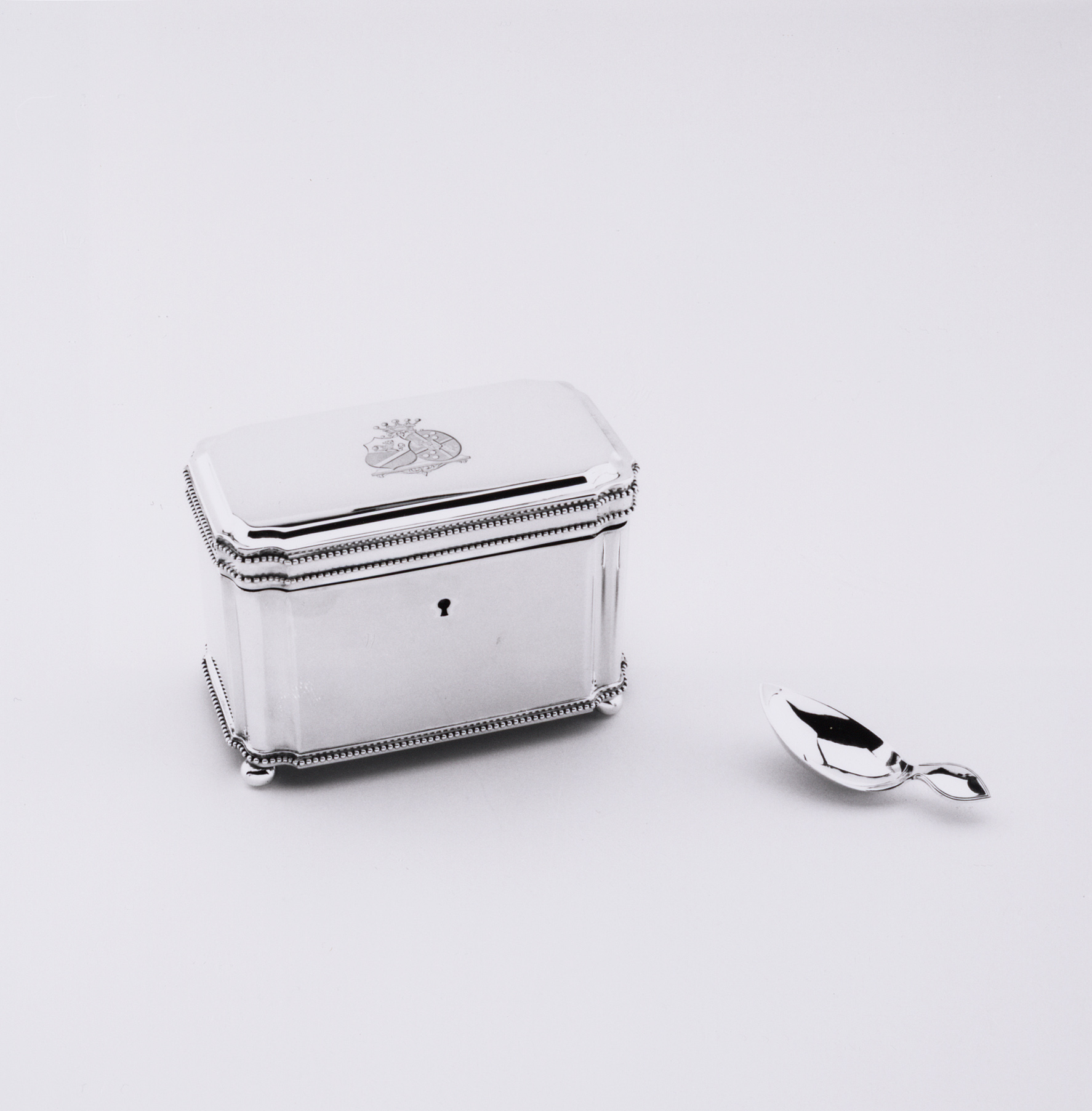 Rechthoekig theekistje met ingezwenkte hoeken en scharnierend deksel op vier afgeplat bolvormige pootjes. Parellijsten langs rand bodem en deksel, het deksel met dubbele parellijst. Op bovenzijde deksel is gegraveerd het gekroonde alliantiewapen Backer-Alewijn. Op binnenzijde deksel is gegraveerd: 1850 19 April 1875/. Sleuteltje ontbreekt.