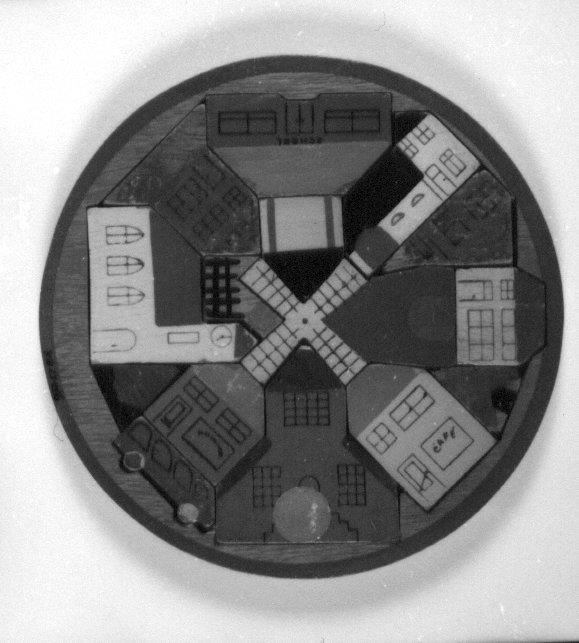Ronde puzzle. Delen: molen, kerk, school, café, auto, huizen- Trefwoorden