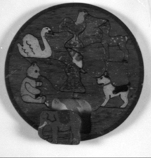 Ronde puzzle, blank gelakt, rode rand. Zeven puzzlestukjes: kabouter, olifant, beer, zwaan, haan, hert, hond.- Trefwoorden