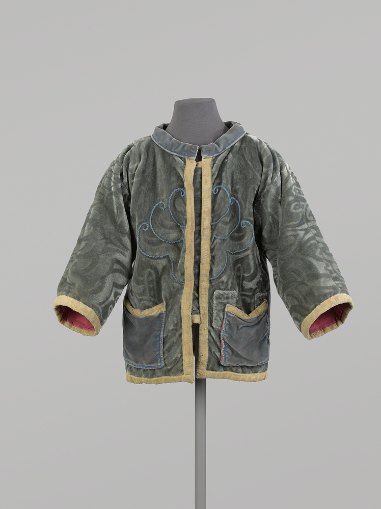 Groen fluweel met patroon, zakken en halsboord van blauw fluweel. Rand, mouwen en zakken afgebiesd met geel band. Voering hardroze. Op voor- en achterzijde in blauw opgeborduurde krullen. Voorsluiting met drukkers.