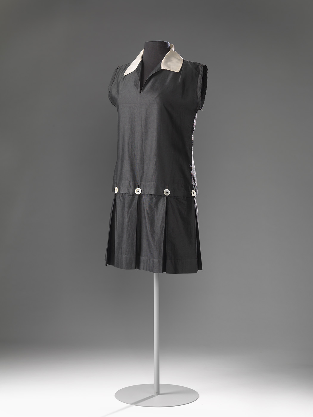 Zwarte jurk met witte kraag en verlaagde taille. Biesjes langs armsgaten. De rok, met dubbele plooien op dijbeenhoogte, wordt door middel van grote witte parelmoerknopen, aan het bovenlijf geknoopt. De rok kan worden losgeknoopt. De knopen zijn met een pijlvormige steek vastgezet. Waarschijnlijk hoorde er een bijpassende korte broek bij.