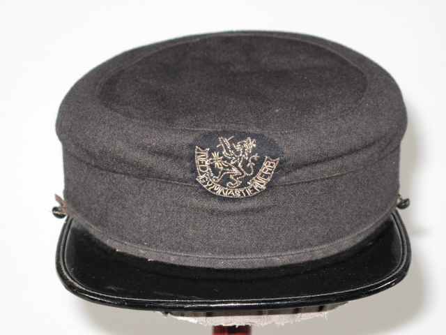Ronde, hoge, zwarte pet. Kleine harde kunststof klep. Aan voorzijde embleem. In de rand kunstleren band.