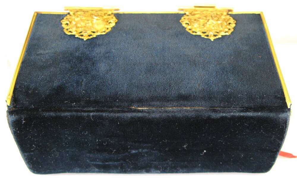 Boekbeslag, bestaande uit twee klamparmen met aanzetstukken en muiters. Reliëfvoorstellingen op een geruwde ondergrond. Bovenste klamparm: Mozes met de Tafelen der Wet, onderste: de hogepriester Aäron, een wierookvat houdend. Op aanzetstukken en muiters de vier evangelisten met hun symbolen, omgeven door een opengewerkte rand van symmetrische bladranken en C-voluten. Bovenste aanzetstuk: Johannes met adelaar, onderste: Lucas met os, bovenste muiter: Mattheus met engel, onderste muiter: Marcus met leeuw. Glad kantbeslag op randen band. Band vervaardigd van donkerblauw fluweel. De band bevat: 'Het Nieuwe Testament [...]'. - Haarlem, Joh. Enschedé en Zoonen, 1810.