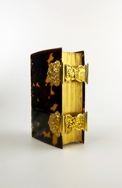 Gouden - en zilveren - boekbeslag uit de achttiende is vrijwel altijd gegoten. Sommige decors - met name de religieuze, bestemd voor bijbels en gezangenbundels - bleven over een langere periode gelijk. Dit was mede het gevolg van het gebruik van dezelfde modellen voor gietvormen. In het Rijksmuseum te Amsterdam berust een groep koperen modellen voor gietvormen van boeksloten, afkomstig van leden van de zilversmedenfamilie De Roever, werkzaam te Amsterdam in 1771-1833 (Ter Kuile 1980-1981, p. 469-473; Ter Kuile 1986, p. 295-305 nr. 413-441; p. 311 nr. 457, 458). Zie voor andere boekbanden van schildpad, gemonteerd met gouden beslag: cat.nr. LA 789, LA 787.