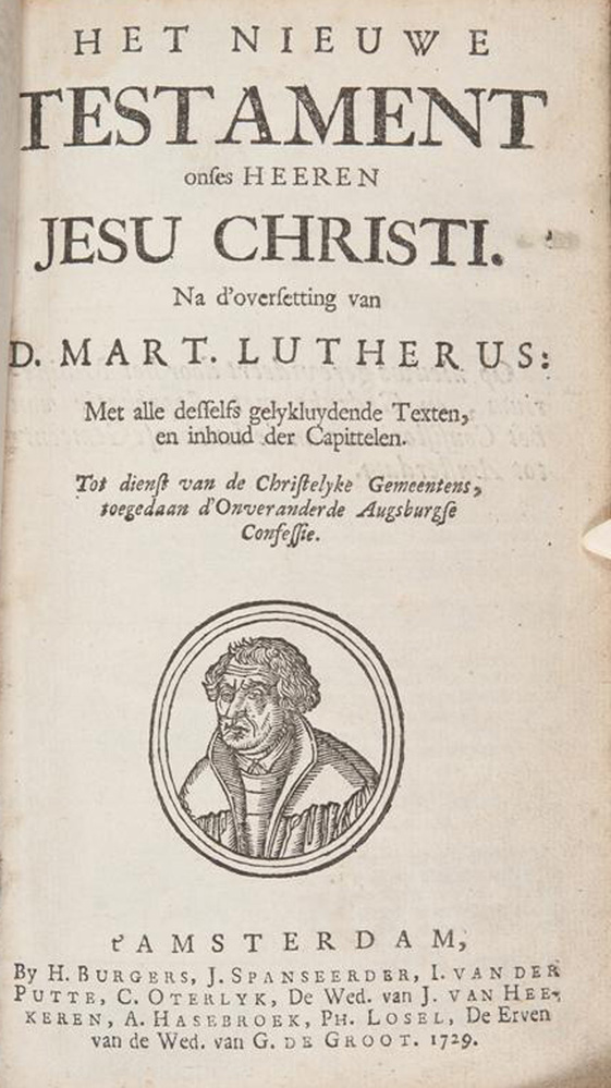 Boekbeslag bestaande uit twee klamparmen met aanzetstukken en muiters. Alle onderdelen met gecontourneerde, geribde randen. Band vervaardigd van zwart haaienleer. De band bevat: 'Het Nieuwe Testament onse Heere Jesu Christi. Na d'oversetting van D. Mart. Lutherus [...]'. - Amsterdam, H. Burgers [et al.], 1729.