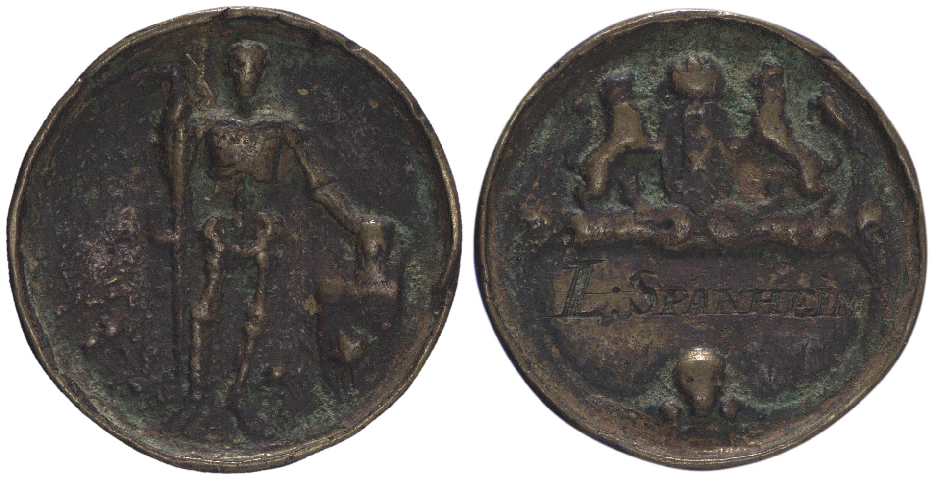 voorzijde: De dood als geraamte en face, een zeis in de rechterhand, de linkerhand rustend op een zandloper, geplaatst op een altaar. keerzijde: Wapen van Amsterdam, gehouden door twee leeuwen, waaronder een cartouche met doodshoofd.
