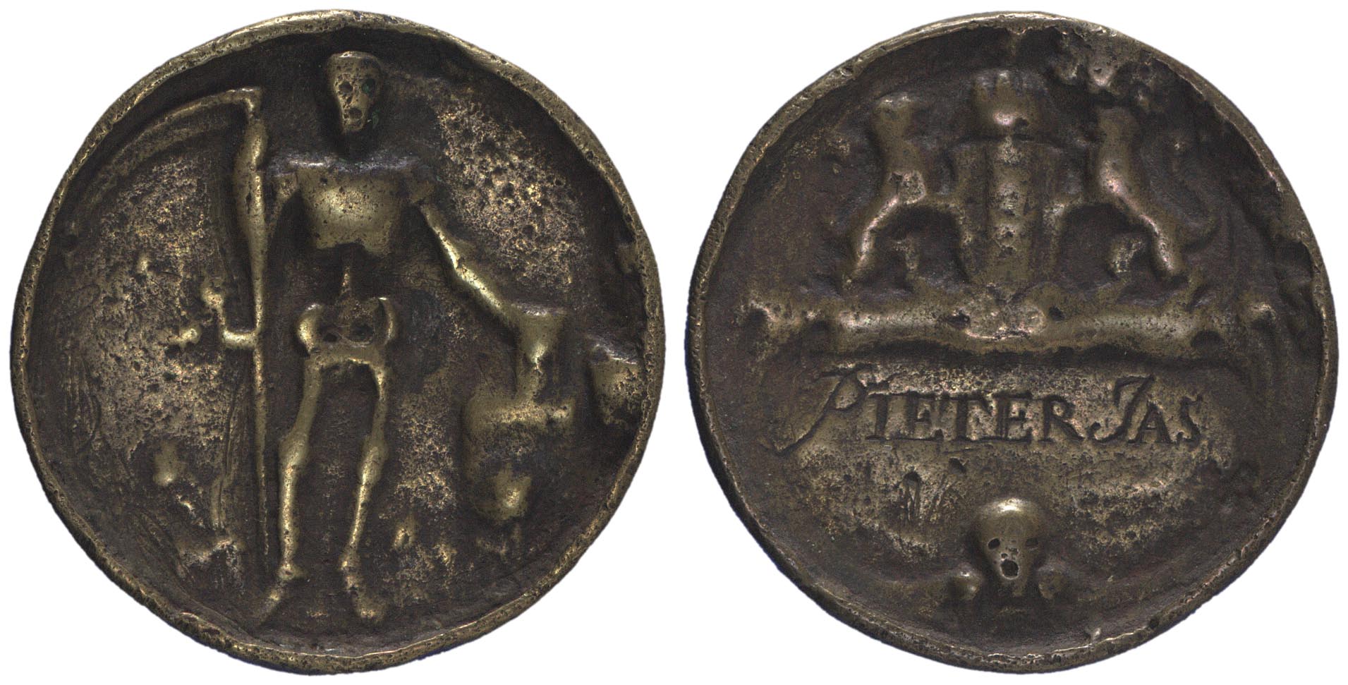 voorzijde: De dood als geraamte en face, een zeis in de rechterhand, de linkerhand rustend op een zandloper, geplaatst op een altaar. keerzijde: Wapen van Amsterdam, gehouden door twee leeuwen, waaronder een cartouche met doodshoofd.