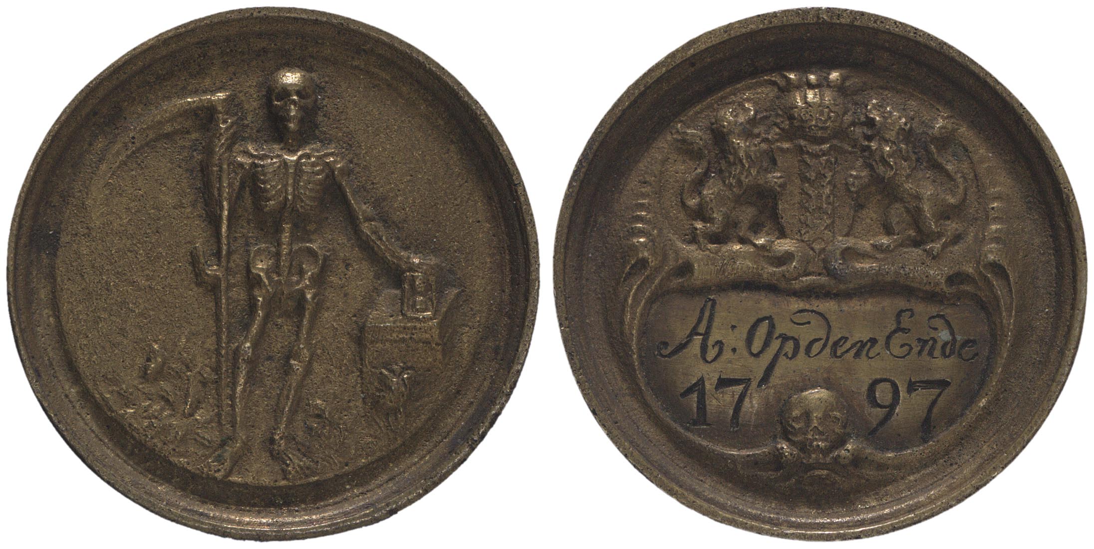 keerzijde: Het gekroonde wapen van Amsterdam, gehouden door twee leeuwen. Daaronder een cartouchte met doodshoofd. In de cartouche een naam en datum.