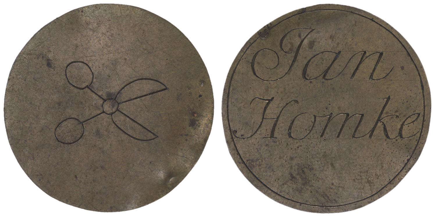 voorzijde: een geopende schaar. keerzijde: binnen een cirkelgroef de naam Jan Homke.- HerkomstCollectie W.F. Vertholen; veiling G.Th. Bom, 8 april 1891, nr. 1166.