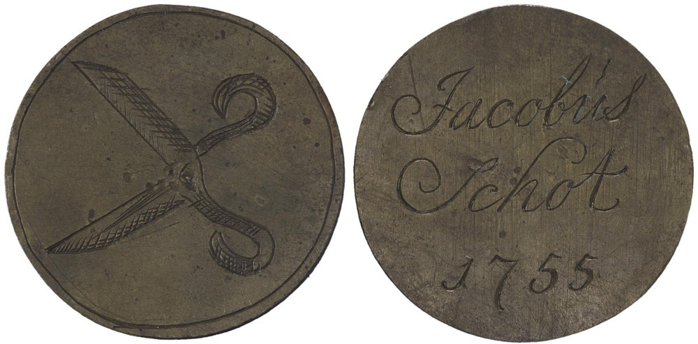 voorzijde: in cirkelgroef een geopende schaar. keerzijde: Jacobús Schot 1755.- HerkomstCollectie W.M.S. van Duren; veiling G.Th. Bom 22 augustus 1865, nr. 3978.