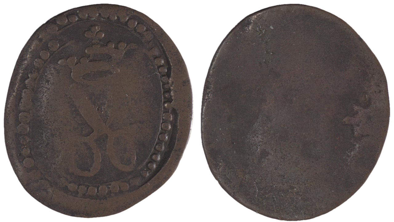 voorzijde: een gekroonde geopende schaar. Parelrand. keerzijde is glad.- HerkomstCollectie A. Voombergh en A.H. Walter; veiling G.Th. Bom, 17 december 1888.
