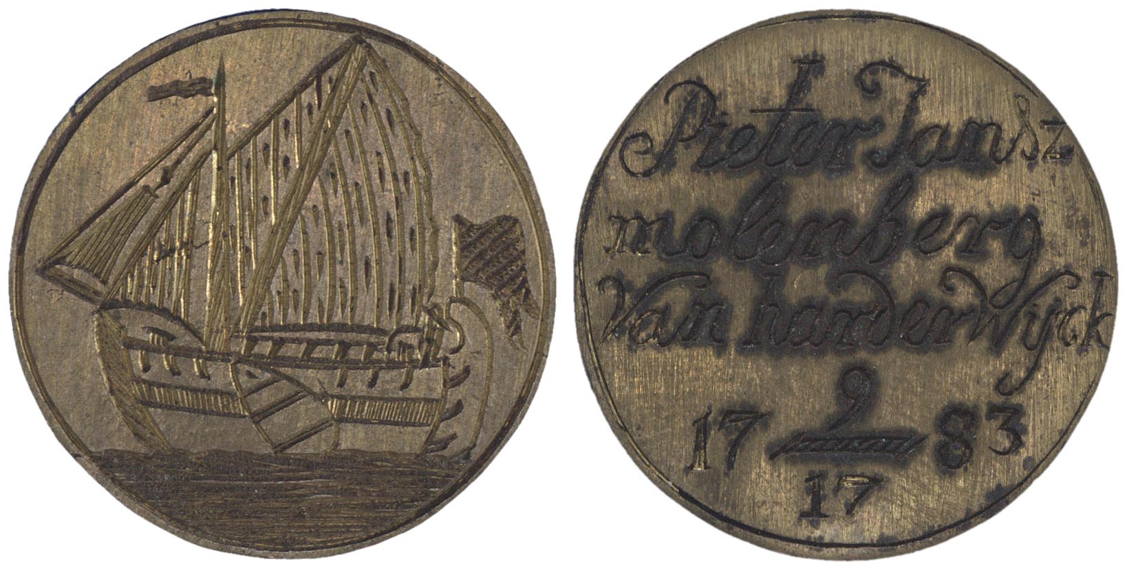 keerzijde: binnen een cirkelgroef: Pieter Jansz Molenberg van Harderwyck 17-9-1783