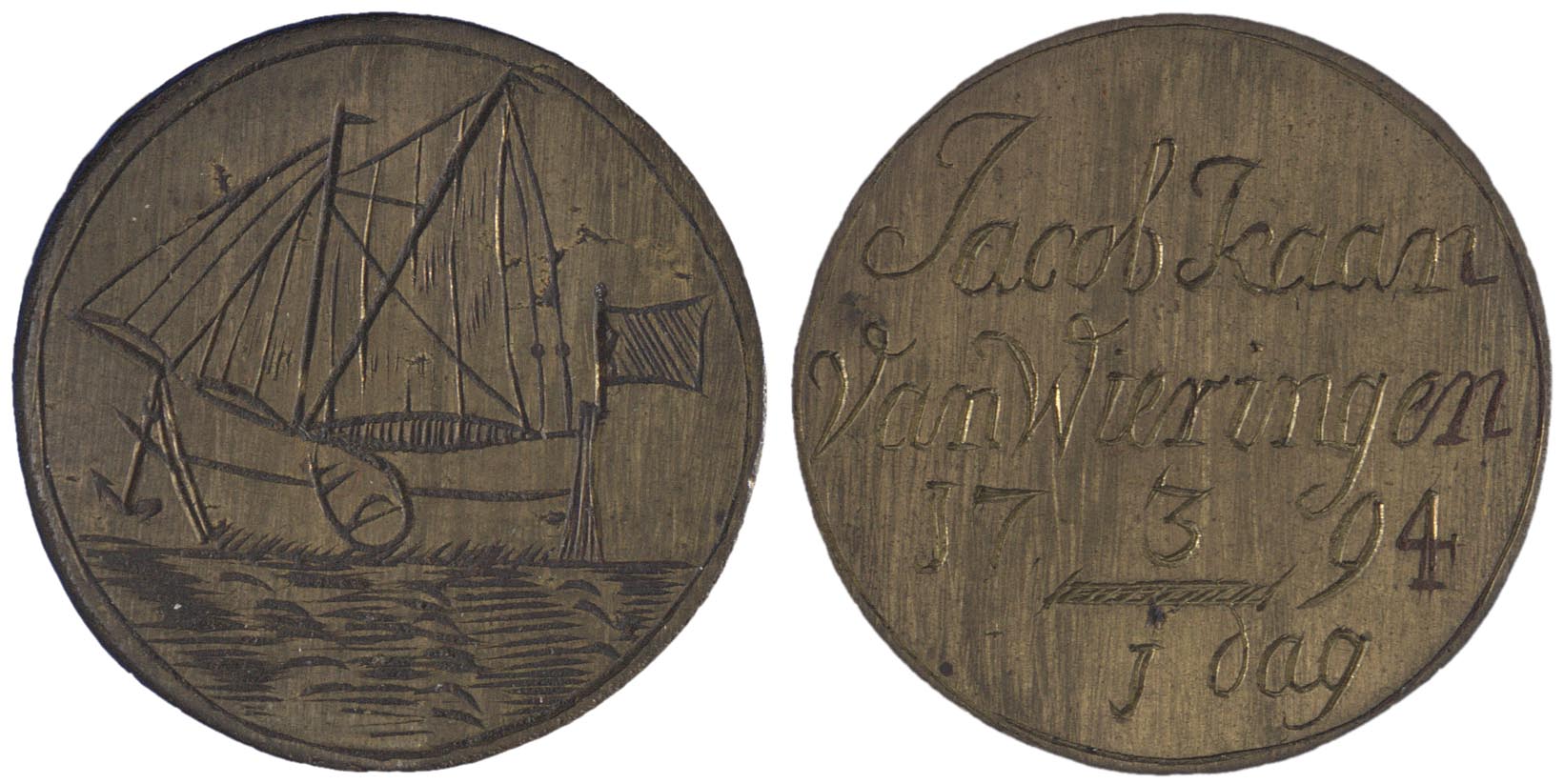 voorzijde: binnen een cirkelgroef een naar links varend zeilschip met twee masten met een anker aan de boeg en een vlag op de achtersteven.