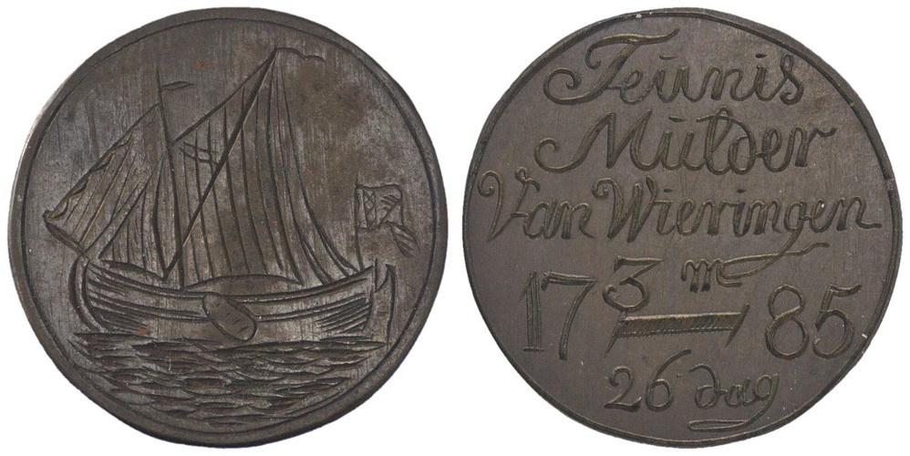 voorzijde: binnen een cirkelgroef een naar links varend zeilschip met een mast, sprietzeil, fok en kluiver. Een vlag op de achtersteven met het wapen van Amsterdam.