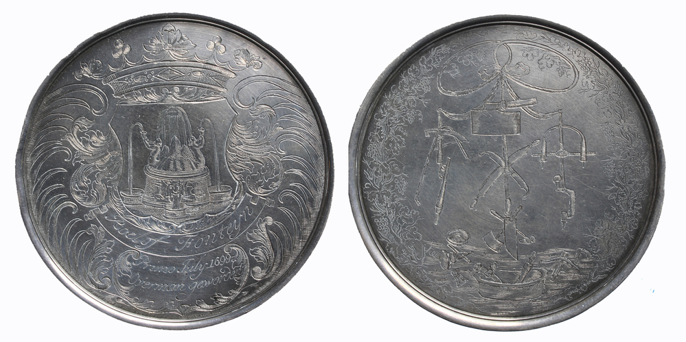 voorzijde: omgeven door puntig krullend bladmotief een gekroond schild waarop een fontein. Onder het schild een lint (banner) waarop een naam staat. Daaronder een cartouche met datum en opschrift.