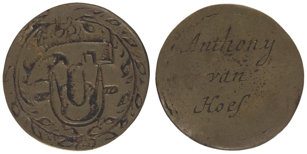 voorzijde: kuiperspasser en hamer in gestrikte bladerkrans. keerzijde: een naam.- HerkomstCollectie J.B. Schöne; veiling G.Th. Bom, 10-12 oktober 1892, nr. 1486, voor fl 1,25 voor twee.