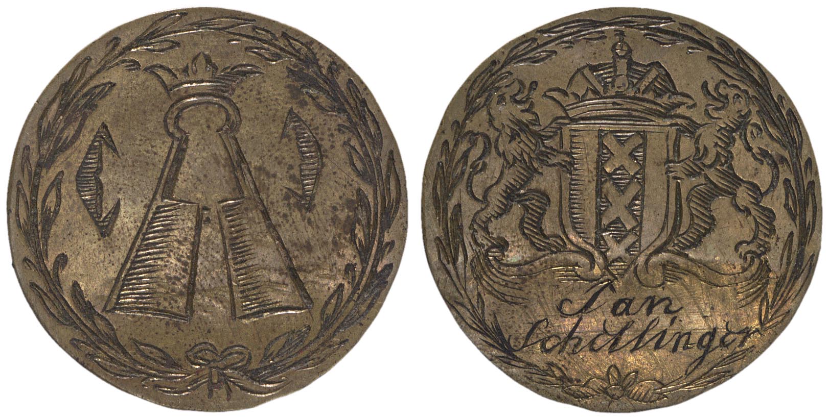 keerzijde: gekroond stadswapen van Amsterdam gehouden door twee leeuwen. Daaronder een naam op schild. Het geheel binnen een bladerkrans, onder gestrikt.