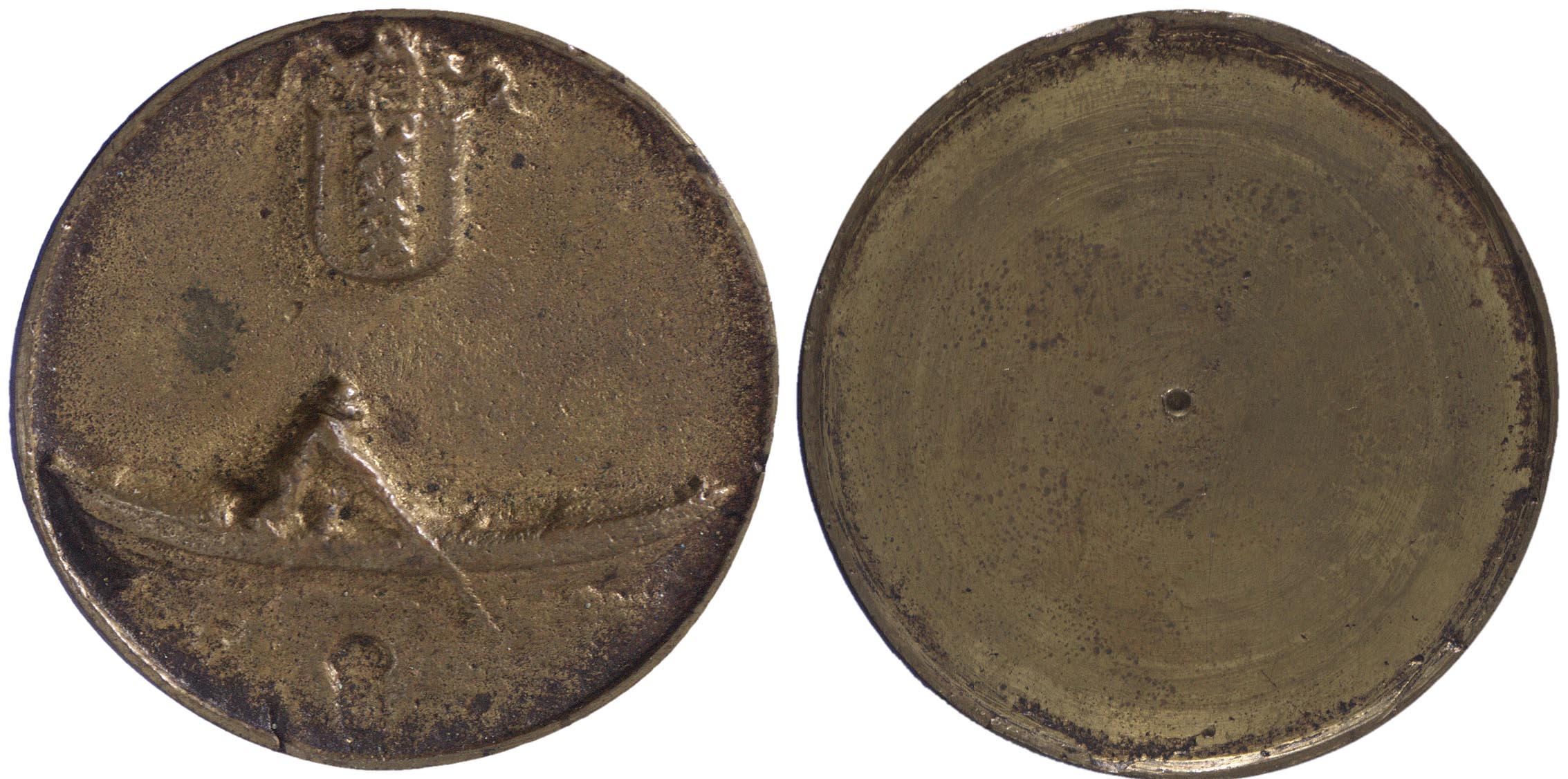 voorzijde: onder het gekroonde wapen van Amsterdam een modderman die zijn schuit voortroeit. keerzijde: een leeg veld.- Trefwoorden