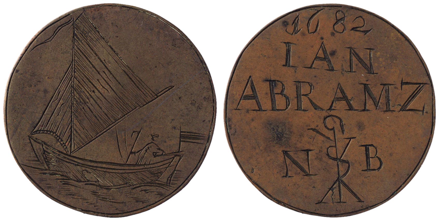 signatuur, datering keerzijde binnen cirkelgroef: 1682 / IAN / ABRAMZ / N B