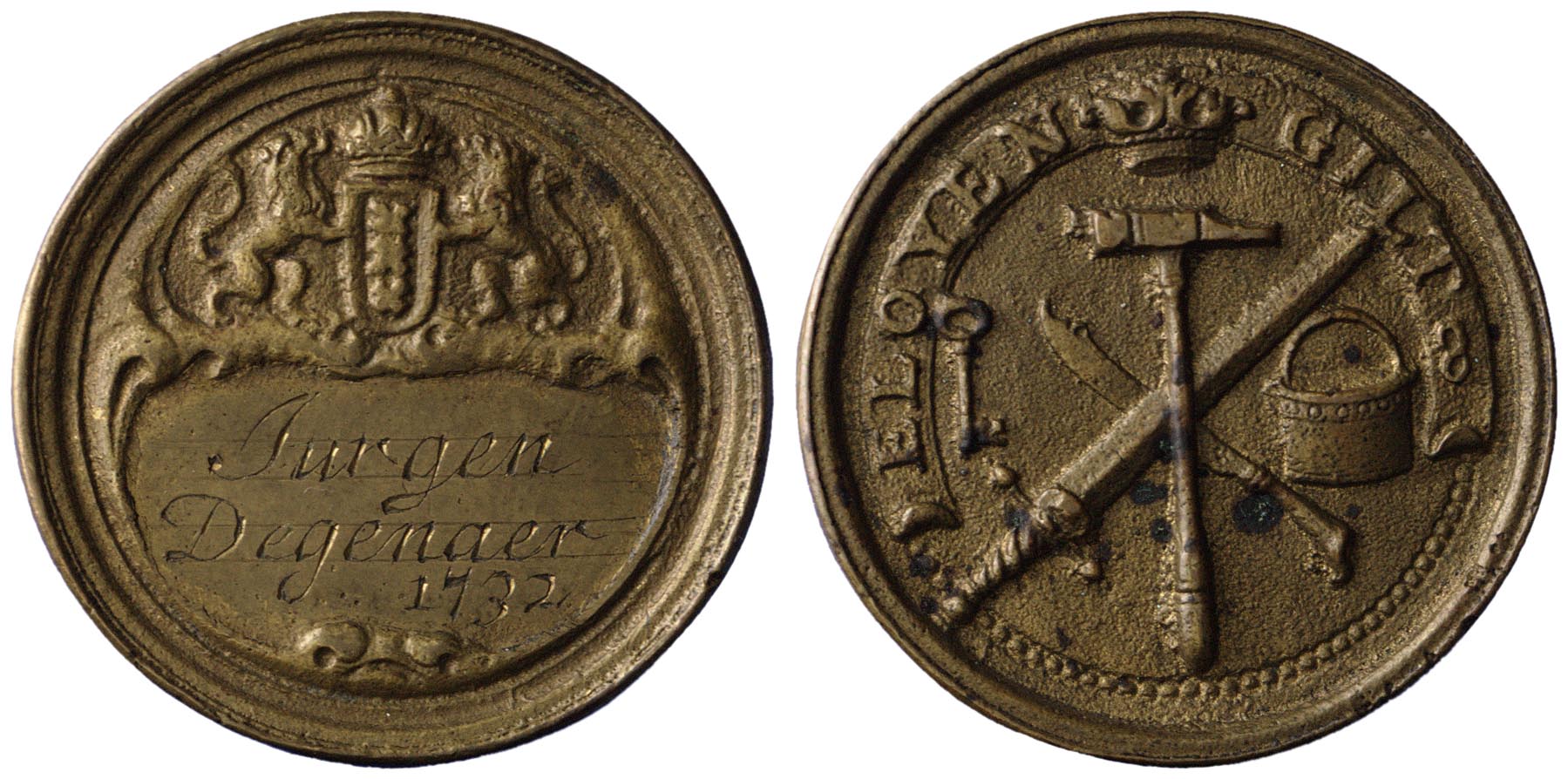 keerzijde: een gekroonde hamer waarachter kruislings een zwaard en een mes, links een sleutel, rechts een ketel. Een omschrift op een wimpel.