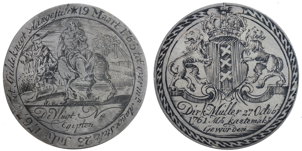 keerzijde: bijbelse voorstelling van de vlucht naar Egypte binnen een cirkelgroef, daaronder een naam. Omschrift.