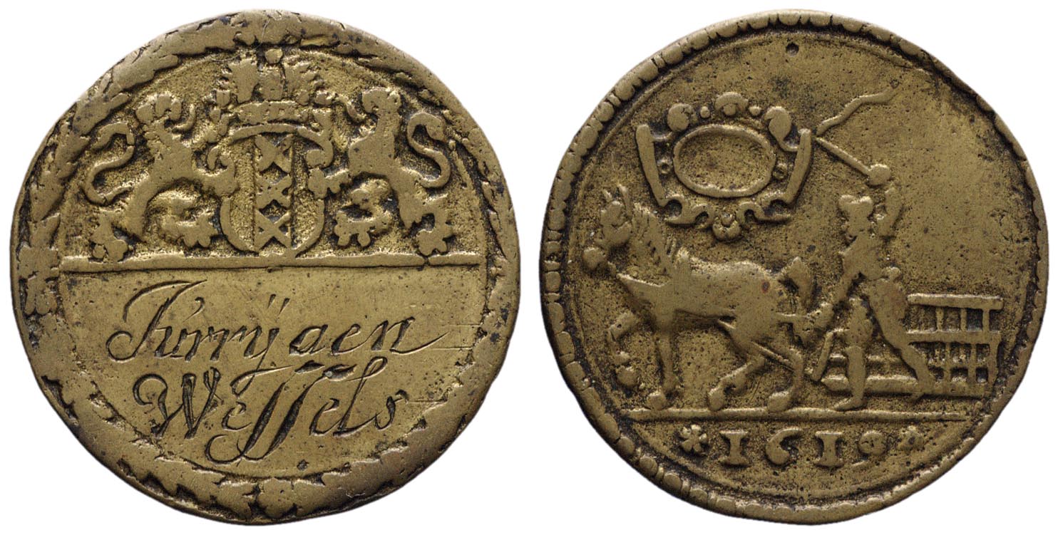 voorzijde: Een sleper met paard en sleep. Onder de afsnede een jaartal. keerzijde: Het wapen van Amsterdam, gehouden door twee leeuwen, onder de afsnede een veld met naam. Rand met lauwerkrans.- Trefwoorden