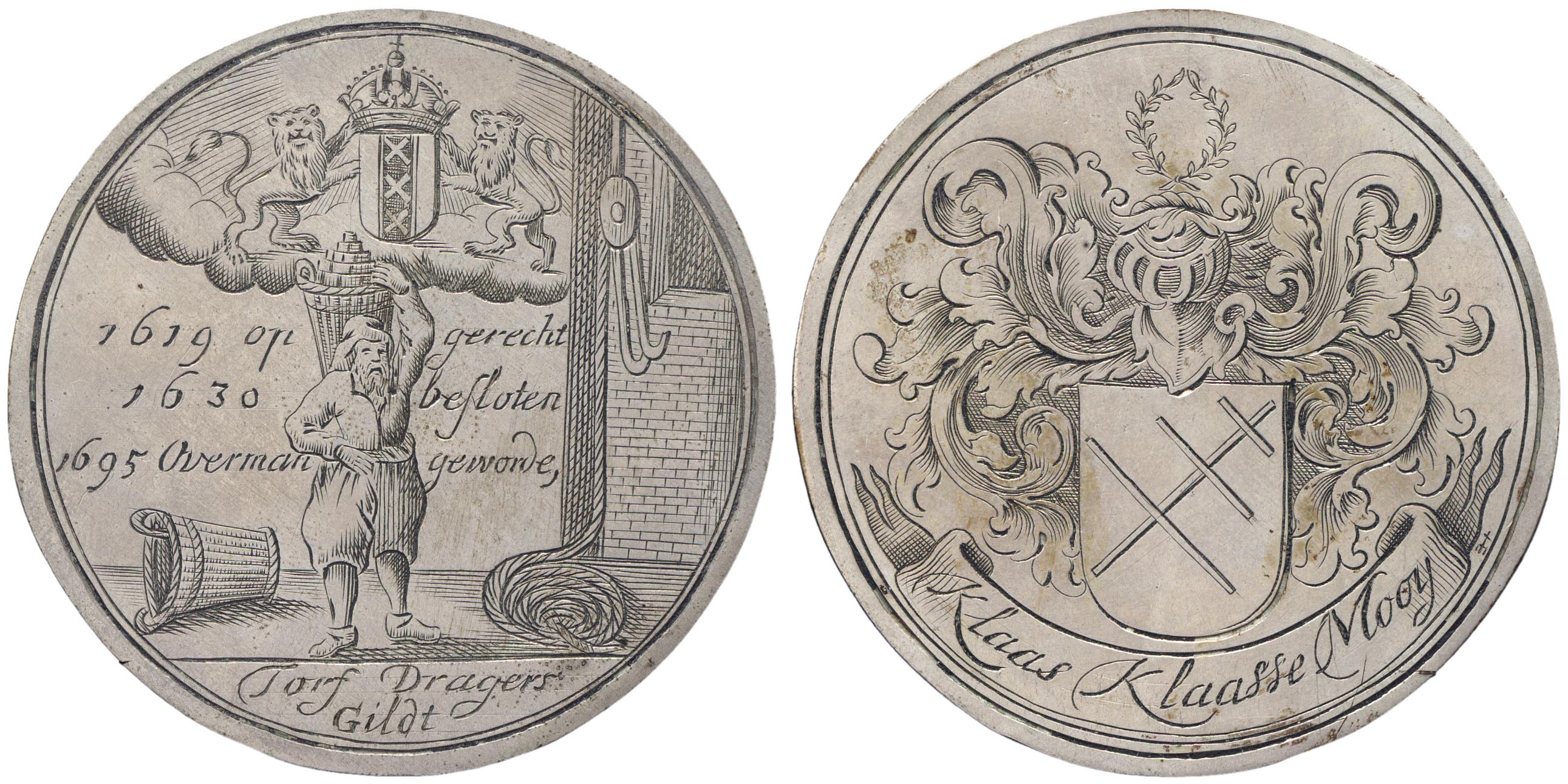 opschrift keerzijde midden: 1619 op gerecht / 1630 besloten / 1695 Overman geworden