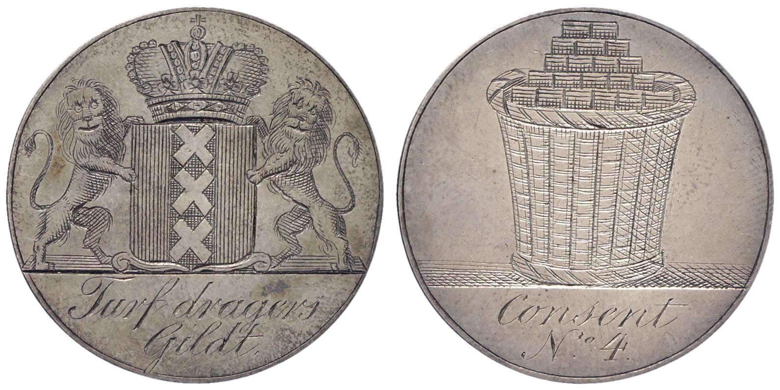 voorzijde: binnen cirkelgroef een gevulde turfmand, afsnede met tekst.