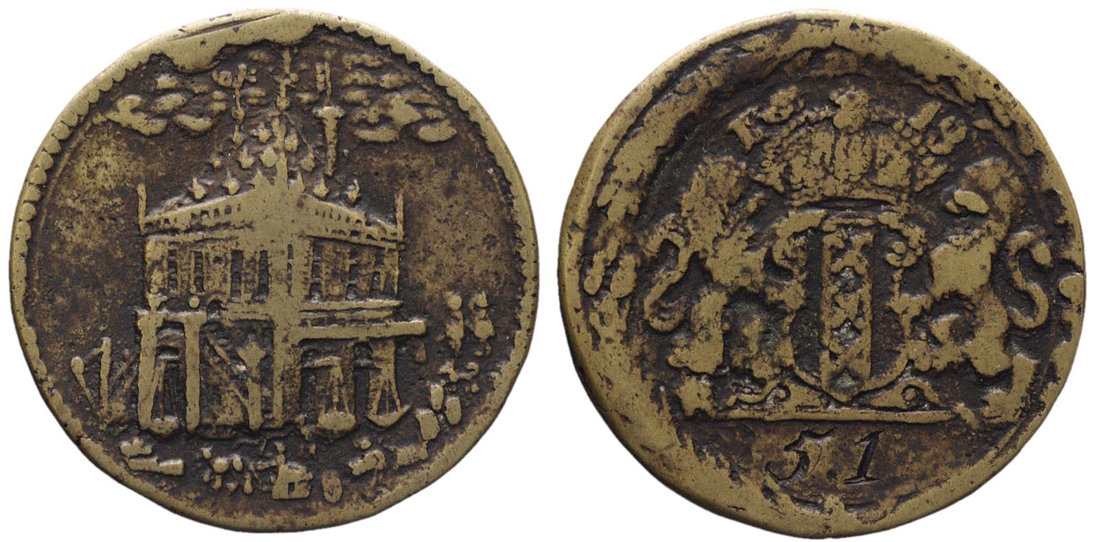 keerzijde: gekroond wapenschild van Amsterdam, gehouden door twee leeuwen onder het jaartal 1618; onder de afsnede numer 51. De rand is voorzien van een palmkrans.