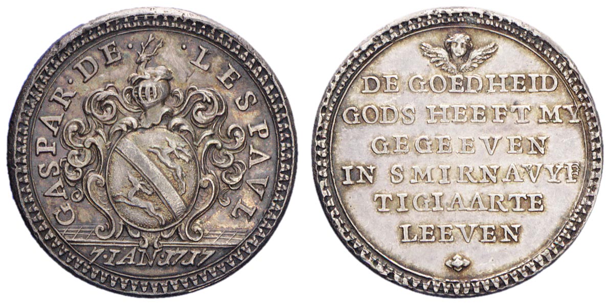 opschrift keerzijde: DE GOEDHEID / GODS HEEFT MY / GEGEEVEN / IN SMIRNAVYF / TIGIAARTE / LEEVEN