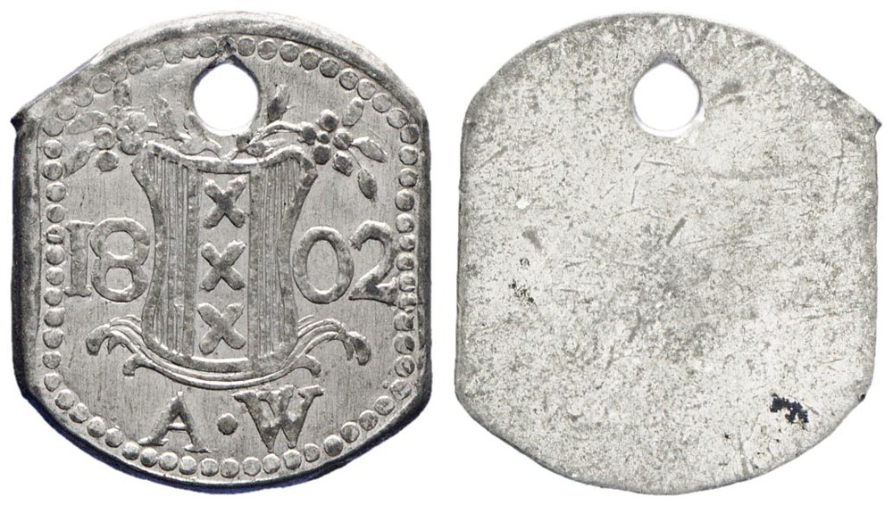 voorzijde: binnen een parelrand het wapen van Amsterdam, versierd met takken. Jaartal,en de letters AW, bovenin een gat. keerzijde: onbewerkt.- Trefwoorden