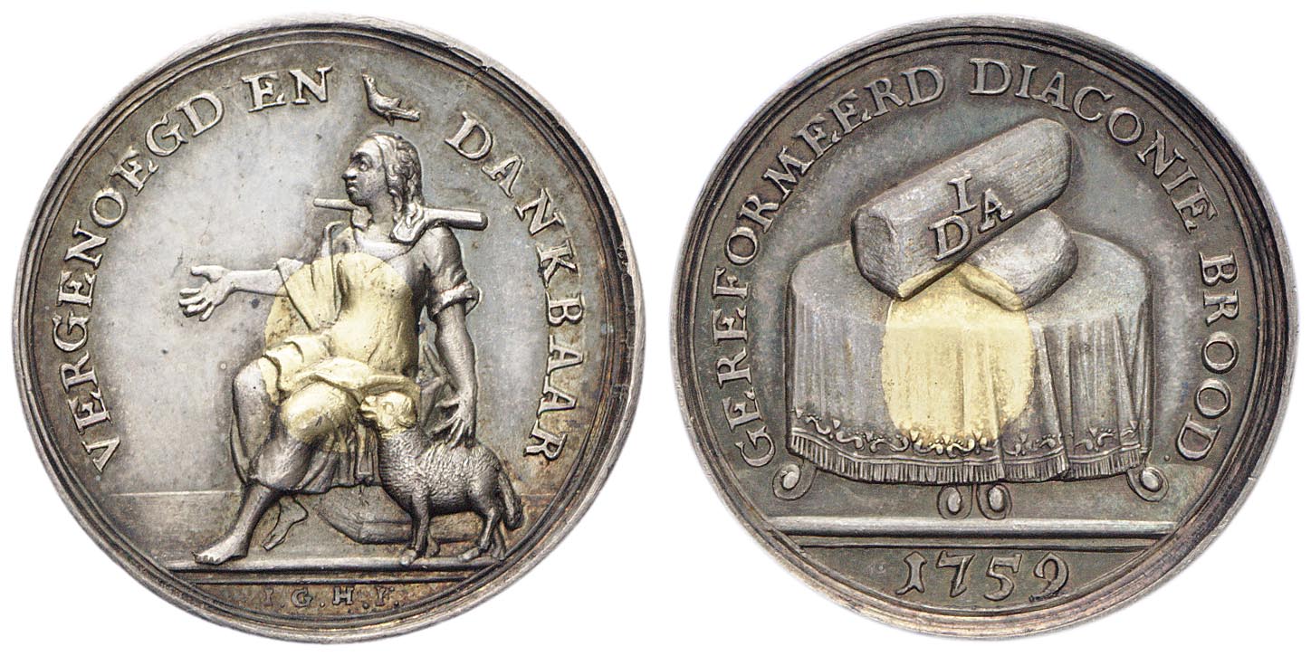 keerzijde: een tafel met gedrapeerd tafelkleed, daarop twee gekruiste broden waarop de letters DIA. Omschrift. Onder de afsnede een jaartal.
